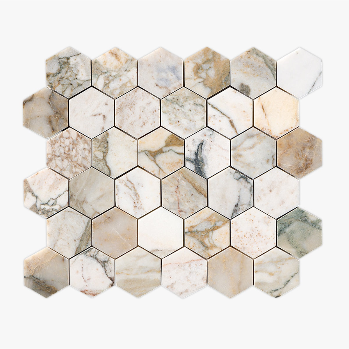 Order a Sample Get a sample of Calacatta Green Honed 2 Inch Hexagon Marble Mosaic for only $5.00.