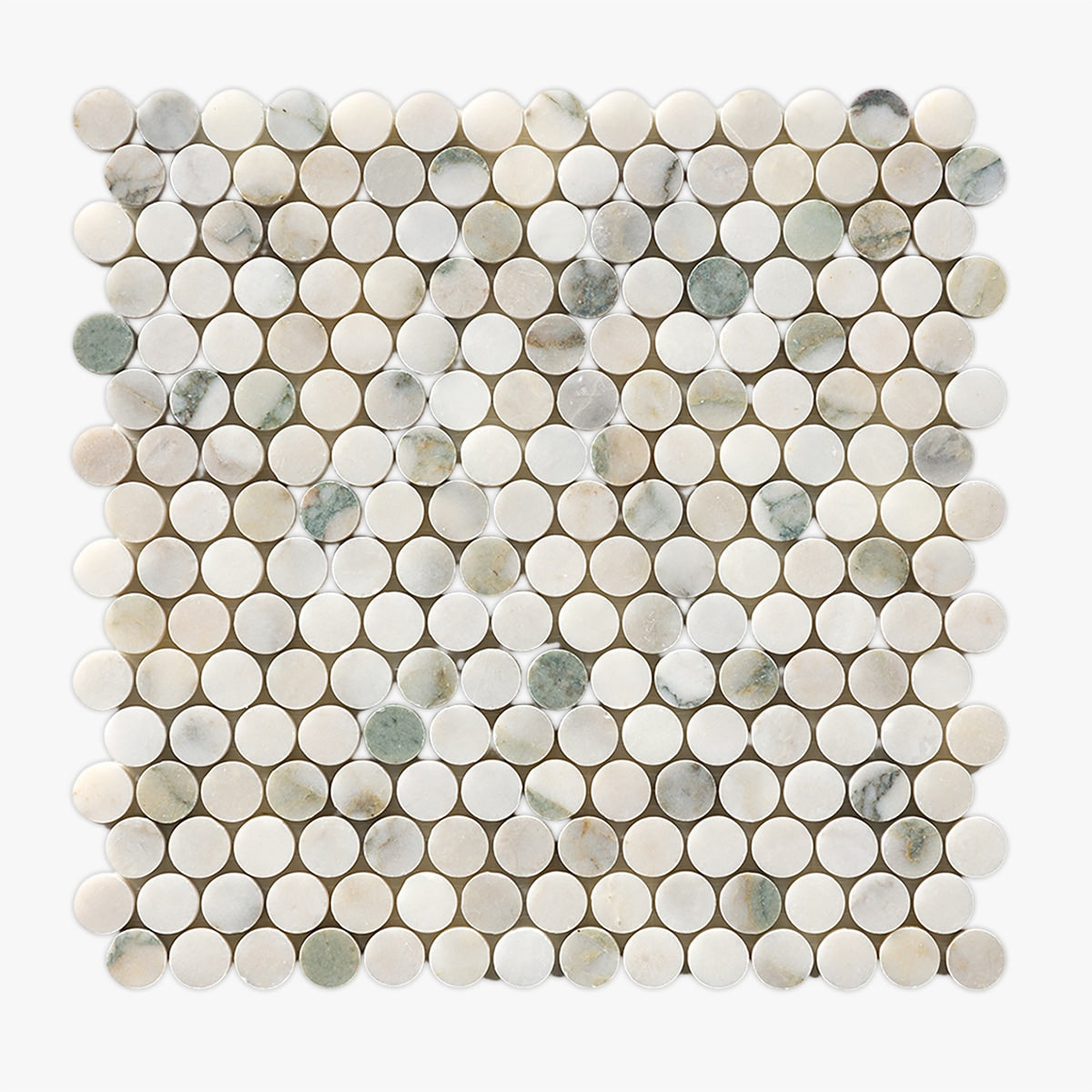 Get a sample of Calacatta Green Honed Penny Round Marble Mosaic for only $5.00.