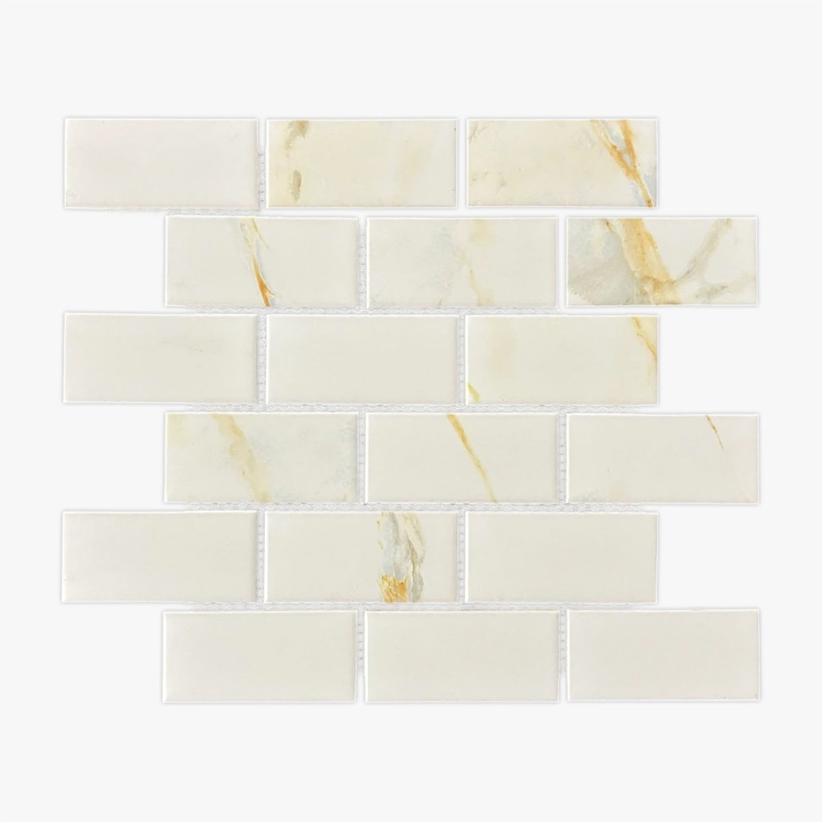 Order a Sample Get a sample of Glamour 2x4 Brick Calacatta Gold Glossy 2x4 Brick Porcelain Mosaic for only $5.00.