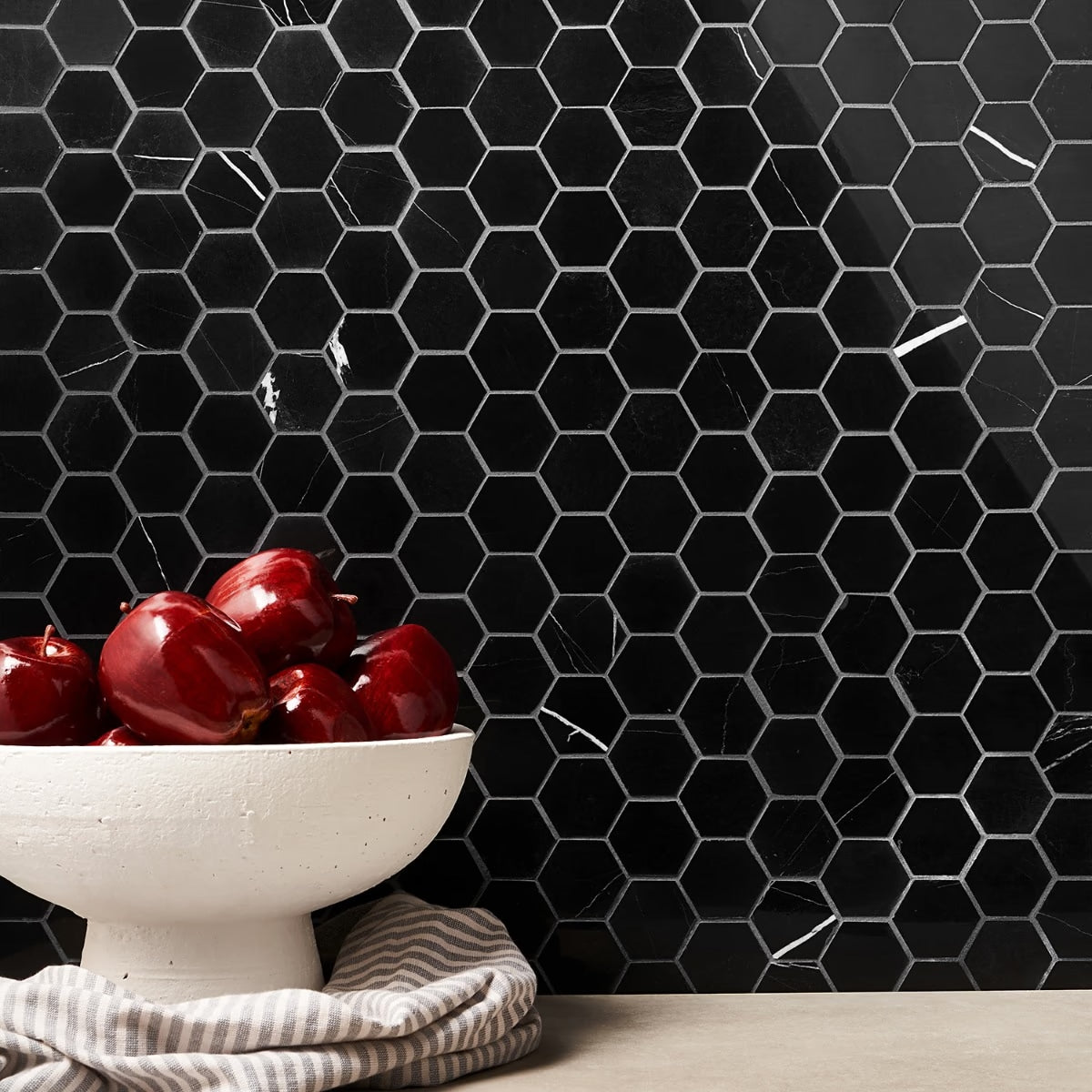 Home Nero Marquina Polished 2 Inch Hexagon Marble Mosaic